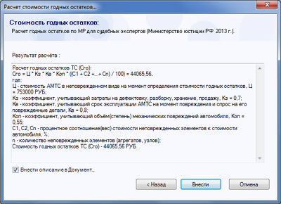 Окно с результатом, который может быть внесен в текущий документ в поле Примечание